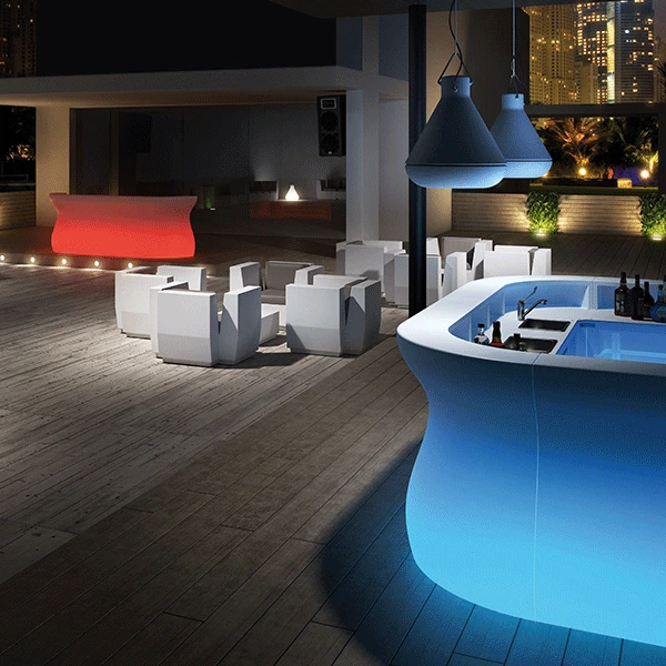 Le Bar Lumineux Modulable Bartolomeo Module d’Angle de chez Plust a été dessiné par Joe Velluto. Alliant esthétisme et design, ce bar s’adapte aussi bien aux espaces intérieurs qu’extérieurs pour créer un lieu convivial et une atmosphère chaleureuse. Son kit lumineux IP67 inclus permet d’éclairer votre bar d’une lumière douce et diffuse. Le module peut être complété par un kit de 4 roues (dont 2 avec freins) et un plateau supérieur en polyéthylène blanc. Il peut être associé au Bar Lumineux Modulable Bartolomeo Module Linéaire afin de créer un bar fonctionnel, une console, ou un bureau. Offrant de nombreuses combinaisons, Bartolomeo vous invite à laisser parler votre imagination et à créer un bar qui vous ressemble.