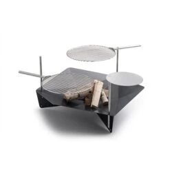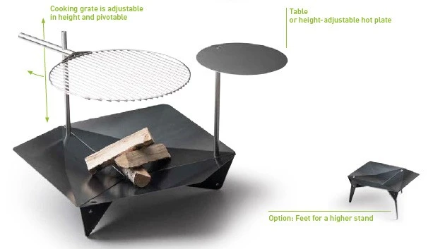 Décliné en 2 dimensions, Triple peut s’agrémenter d’une grille de cuisson et d’une petite table disponibles en accessoires. Le Braséro Triple en diamètre 90cm peut également être surélevé de 20cm grâce à des pieds vendus séparément (ne conviennent pas au braséro 120cm).