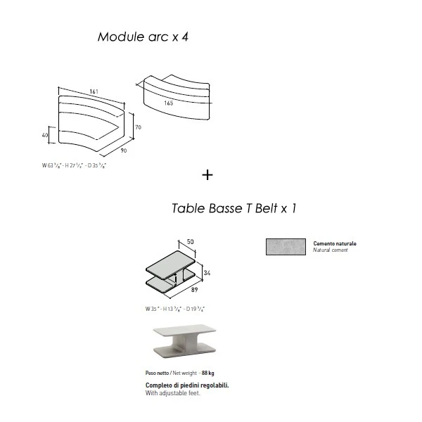 Attention: la table basse au centre de l’image principale n’est pas incluse. L’image principale représente 2x canapés arc de cercle avec table basse Belt mis face à face.