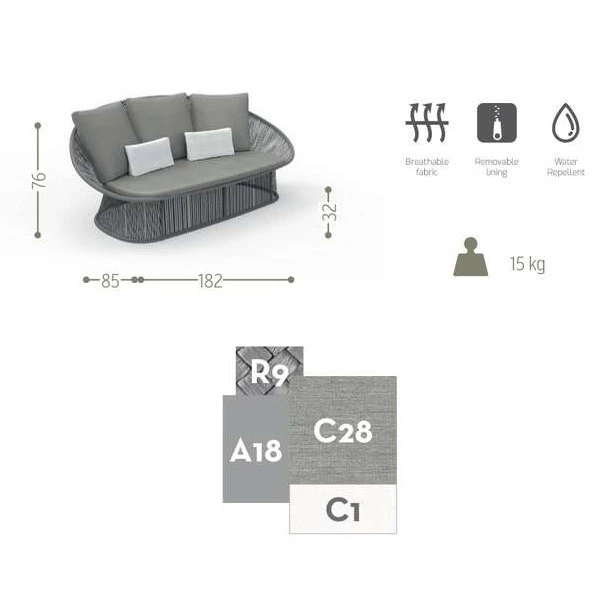 Le Canapé Rope de chez Talenti est un canapé au design très élégant. Imaginé par le studio Talenti, le canapé fait partie de la collection Rope, une collection caractérisée par une structure en aluminium gris recouvert de poudre, recouverte d’un tissage de cordes en tissu synthétique gris. Cette conception lui confère une haute résistance aux températures extrêmes, aux UV et aux intempéries. Le canapé est doté d’un coussin d’assise et de dossier de couleur gris. Sur une terrasse ou au bord d’une piscine, ce mobilier est parfait pour profiter de moments de détente. Il s’intégrera parfaitement dans vos environnements et leur apportera une note de design supplémentaire.