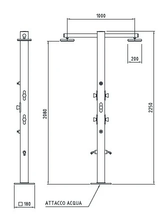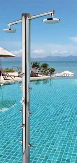 La Douche d’Extérieur Double Nettuno de chez Ama Luxury Shower est une douche double ultra-contemporaine Made In Italy. Cette douche d’extérieur avec 2 têtes de douche est réalisée en acier inoxydable AISI 316 brillant. Elle est idéale pour aménager un espace extérieur qu’il soit privé ou collectif. Elle vient se fixer au sol grâce à sa platine de fixation en acier inoxydable (visserie non incluse, dépend du type de configuration). Nettuno dispose de 2 têtes de douche en acier inoxydable de diamètre 20cm. Elle est équipée de 5 robinets temporisés (arrêt automatique après la pression au bout de 7/15 sec) et de 2 lave-pieds avec aérateur. Avec son acier inox et son look moderne, la douche double Nettuno saura prendre place dans n’importe quel type d’environnement extérieur.