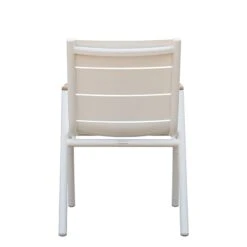 La version du Fauteuil Pilotis Aluminium joue le parti pris du look aluminium avec une touche de teck. Il associe une structure tubulaire aluminium blanche à un habillage en lattes aluminium laqué blanc et des accoudoirs en teck finition naturelle (non huilé).