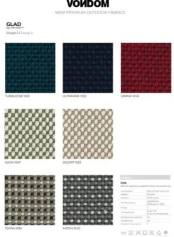 La Collection Suave se caractérise par une méthode de production incroyablement résistante, l’injection de polyuréthane, combinée à un tissu premium Glad, offrant résistance et durabilité. Ce tissu en polypropylène offre un toucher agréable tout en étant totalement adapté à un usage extérieur.