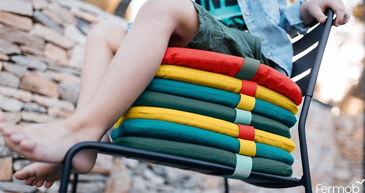 Avec ses coloris très tendances, cette galette Color Mix s’harmonise parfaitement avec les couleurs de métal de la large palette Fermob.