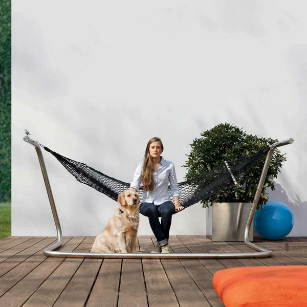 Le Hamac de la marque Coro est parfait pour des moments de farniente en extérieur. Avec sa structure en inox satiné au design minimal et sa toile au proportion généreuse, vous pourrez profiter du soleil, lire un magazine ou tout simplement plonger dans une sieste réparatrice. Placez-le sur une terrasse, en dessous d’un arbre ou au bord d’une piscine et glissez-vous simplement dedans. Ce hamac est livré avec une toile en nylon tressé noire.