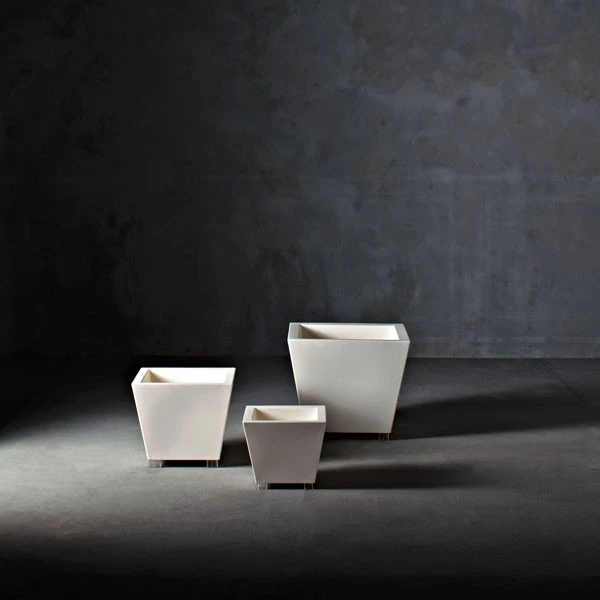 Cette jardinière en polyéthylène se caractérise par des lignes élégantes et intemporelles et est mise en valeur par des pieds transparents amovibles.