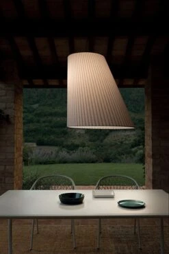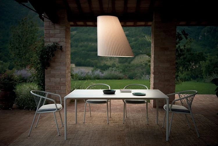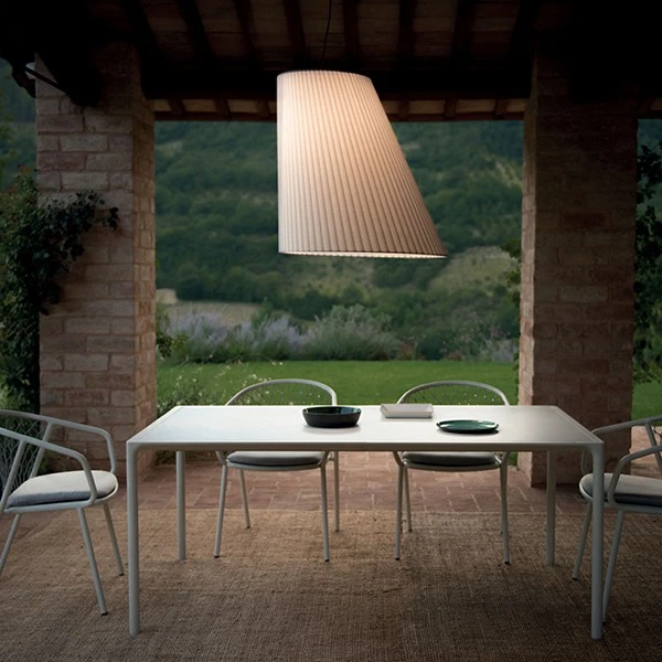 La Suspension Cone de chez Emu est une suspension design dessinée par le studio Chiaramonte Marin. Cette suspension s’inspire des formes des abat-jour des années 50′. Avec un côté vintage et élégant, Cone passe de l’intérieur à l’extérieur pour le plus grand plaisir des amateurs de design. Cette lampe est modernisée avec ses matériaux polycarbonate et acier verni. Cone vient se suspendre à un plafond de terrasse couverte, au-dessus d’une table de repas ou d’un salon de jardin. Non seulement, elle vient apporter du cachet à une décoration extérieure mais également une belle lumière d’ambiance. Cone est disponible en 2 coloris de structure en acier: blanc mat ou corten. Chaque version est accessoirisée d’un « dress code » (abat-jour en polyester imprimé) effet plissé à disposer sur le diffuseur de la lampe.