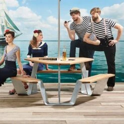 La Table Anker de chez Extremis a été conçue par le designer Dirk Winants. Cette table de repas tire son nom d’un mot hollandais signifiant « ancre » pour faire allusion à sa forme de profil. Les pieds, le cadre et le plateau central sont déclinés en acier galvanisé et en acier laqué. Tandis que le banc et le plateau se déclinent en bois Iroko (bois dur tropical) ou en bois HELLWOOD (bois thermo-traité 100% PEFC). Plus qu’une simple table de pique-nique, ce mobilier à la forme triangulaire est une invitation à de chaleureux repas en plein air. Conçue pour 6 personnes, cette table accueille également un parasol à son centre.