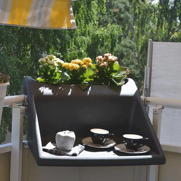 La Table d’appoint à suspendre Balkonzept de chez Rephorm, est une réelle innovation signée Michael Hilgers. Pratique, tendance, fonctionnelle, cette table d’appoint est spécialement conçue pour vous chers citadins qui disposez d’un petit espace extérieur. Cette création gain de place permet d’apprécier vos moments de détente en plein air même si votre espace extérieur est exigü. Cette table d’appoint à suspendre est conçue avec une encoche pour s’accrocher en toute sécurité à toute balustrade de balcon ou terrasse, qu’elle soit ronde, carrée ou plate. Elle ne se fixe pas et peut donc être enlevée et réinstallée en un clin d’oeil. Petit apéro, pause lecture, travail en plein air, la table d’appoint pourra supporter vos verres, bouteilles, cendrier, ordinateur, bouquin. La table dispose également d’une jardinière intégrée, vous pouvez donc planter des fleurs, des herbes aromatiques ou encore y disposer vos boissons pour un gain de place lors de vos apéritifs. Les côtés relevés de Balkonzept permettent que ce qu’on y pose ne s’envole pas. Nouveau, tendance, et pratique, Balkonzept est l’objet incontournable des petits espaces branchés!